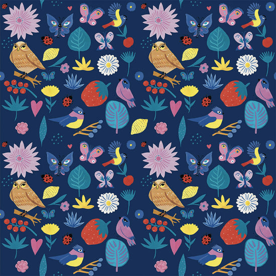 Fraises, coeur, chouette, oiseaux et fleurs se croisent dans ce motif pour annoncer l'arrivée du printemps !