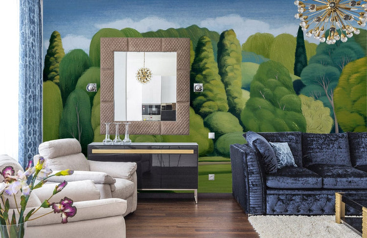Murale de paysage forestier serein dans un salon avec un paysage forestier luxuriant