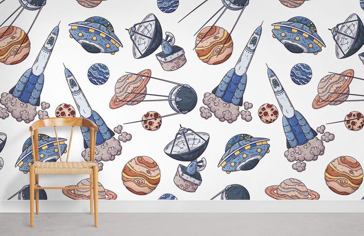 Voyage dans l’espace II papier peint mural cosmos et chaise en bois
